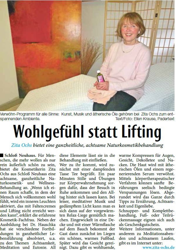 Zita Ochs aus Schloß Neuhaus bietet ganzheitliche, achtsame Naturkosmetikbehandlung